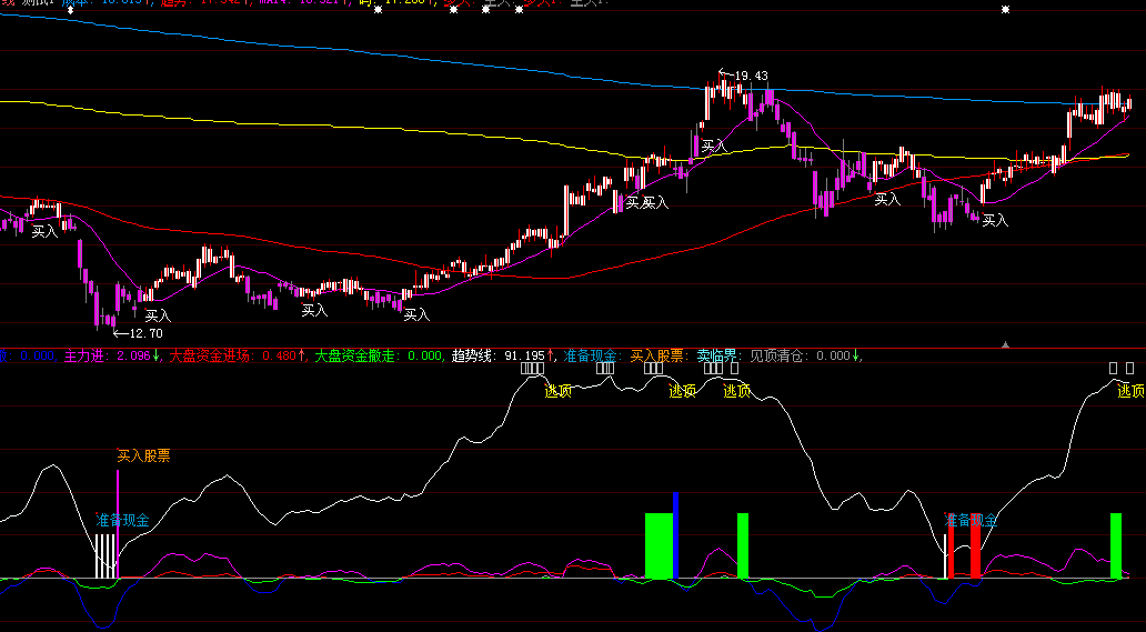 {stickline(主力进 and 趋势线<13,0,40,10,0),colorff00ff};