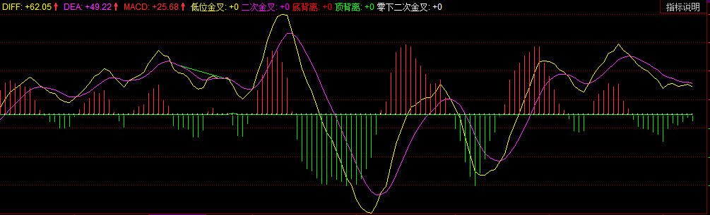 低位金叉:IF(CROSS(DIFF,DEA) AND DIFF<-0.1,0.3,0),coloryellow,POINTDOT;