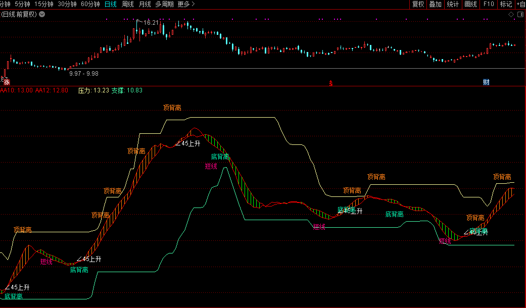 EMA8,'∠45上升'),COLORWHITE;压力:MA(REF(HHV(C,30),1),2),COLOR9DFFFF;