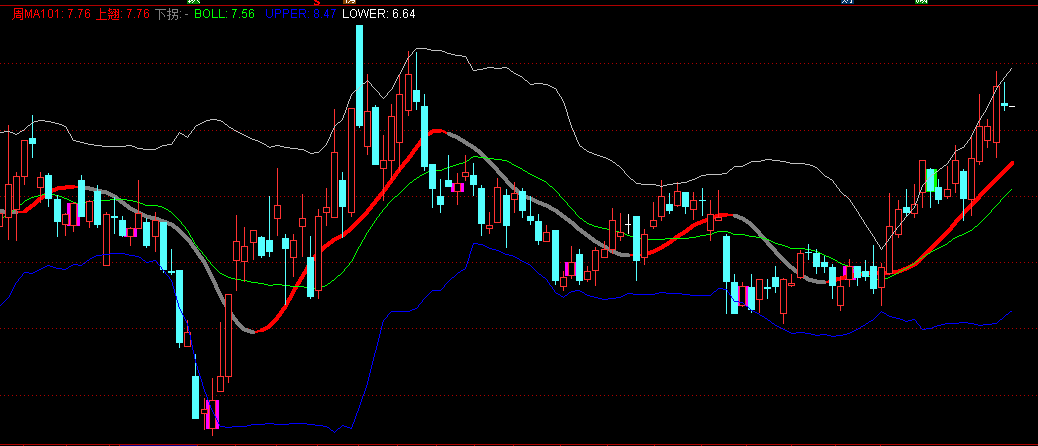 上翘:IF(周MA101>REF(周MA101,1),周MA101,DRAWNULL),COLORRED,LINETHICK4;