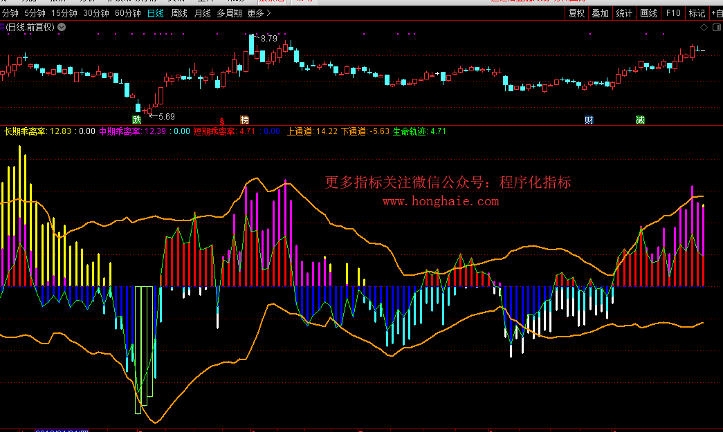 IF(中期乖离率<=0,中期乖离率,0),COLORFFFF33,STICK,LINETHICK3;