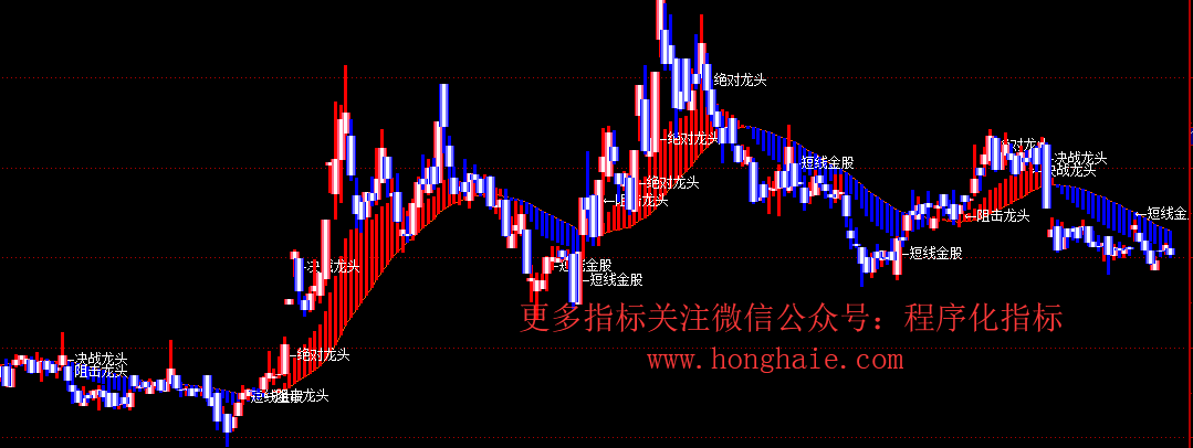 DRAWTEXT((B > 0),(LOW * 1.02),'←决战龙头'),LINETHICK0,COLOR0055FF; DRAWTEXT((D > 0),(LOW * 1.05),'←绝对龙头'),LINETHICK0,COLORRED;