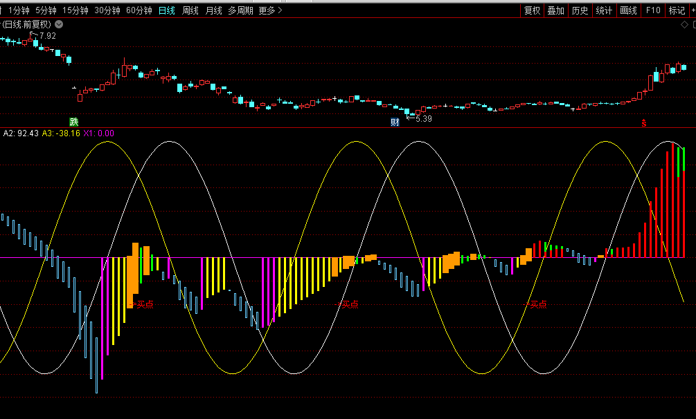 底部注意: STICKLINE(VAR6>REF(VAR6,1) AND VAR6<0 AND VAR6<VAR8,VAR6,0,1,0),COLORFF00FF;