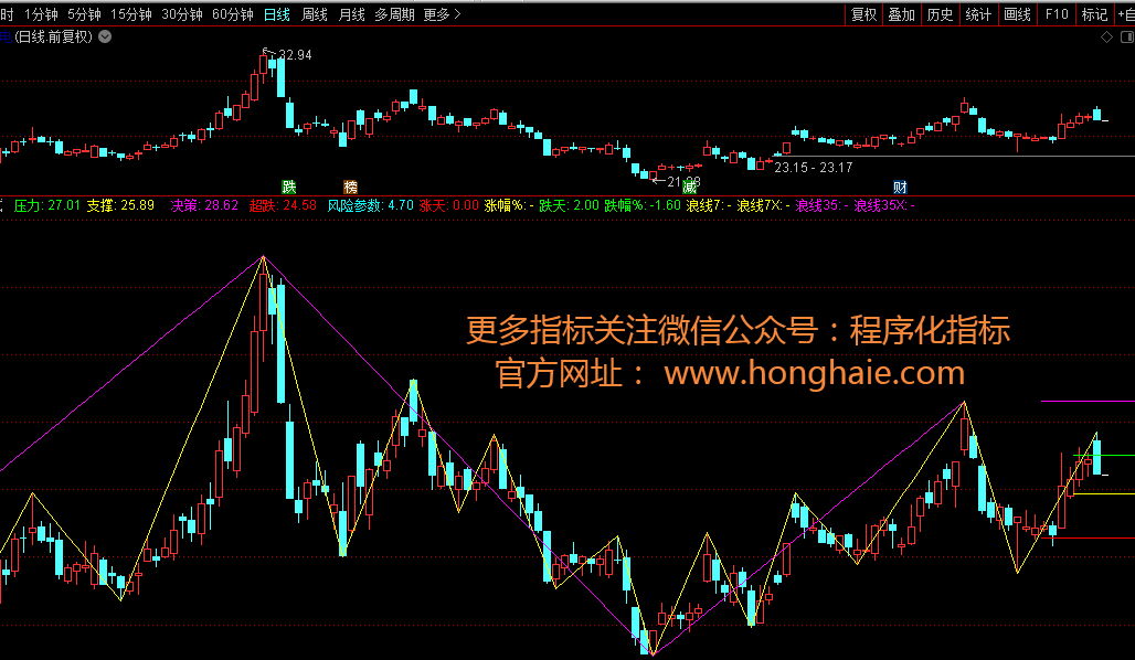 浪线35:DRAWLINE(H=HHV(H,35),H,L=LLV(L,35),L,0),LINETHICK1,COLORMAGENTA;