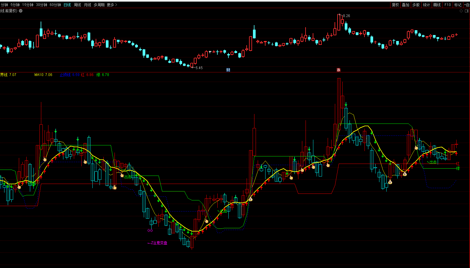 DRAWTEXT(CROSS(绿,止损线),L*0.99,'↖出击'),COLORGREEN;