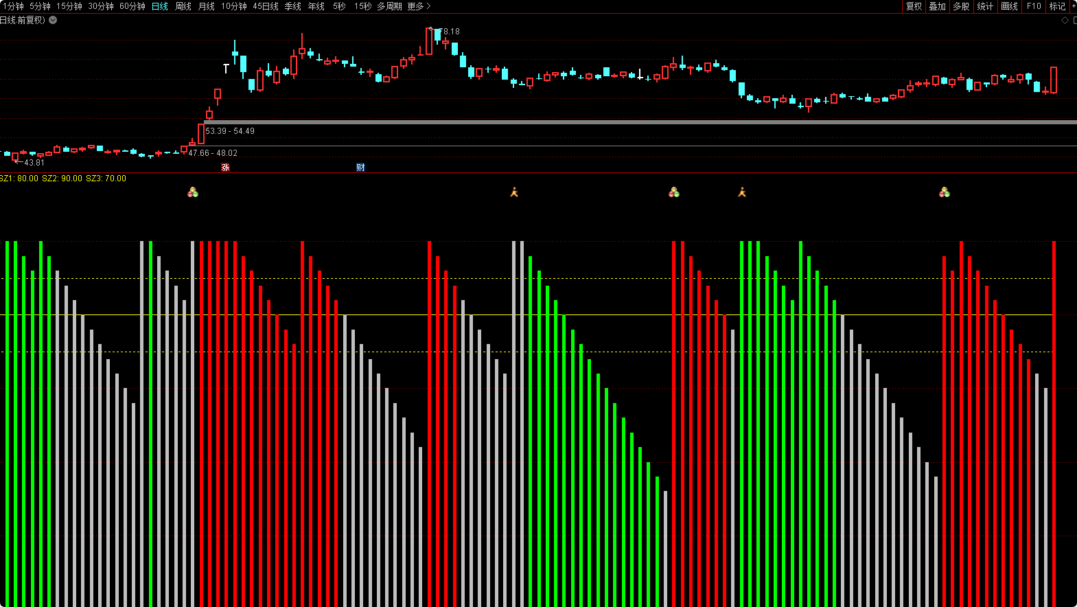 STICKLINE(X_2>X_3 AND MACD.DIF<0,X_2,0,1,0),COLORLIGRAY;