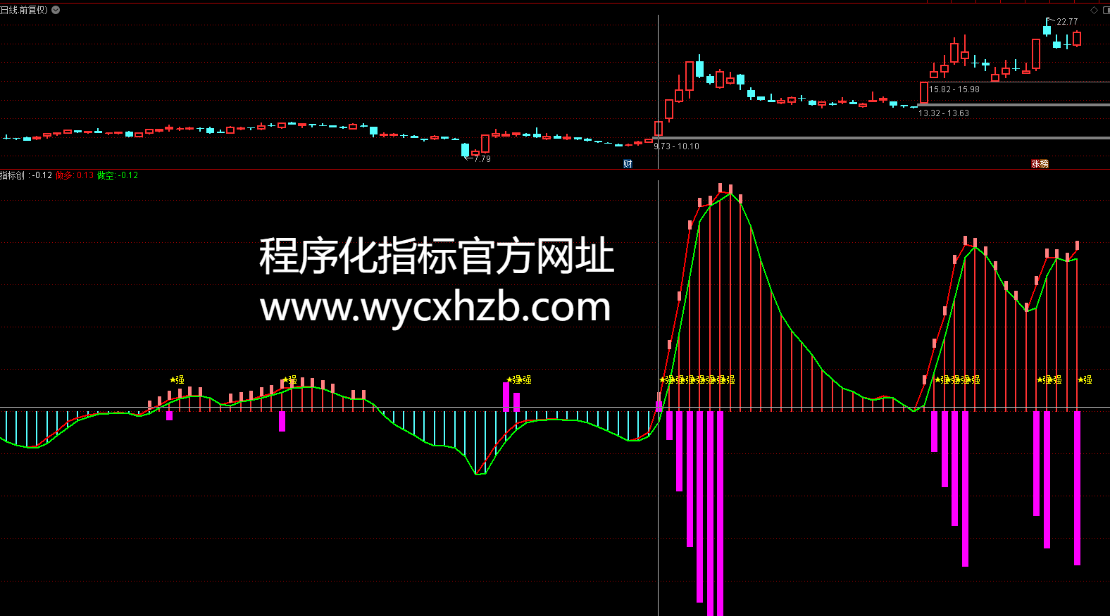 强势:STICKLINE(HG>5 AND DIFF>DEA AND C>=EMA(C,5) AND A1-B1>0,0,-做空,2,0 ),COLORMAGENTA;
