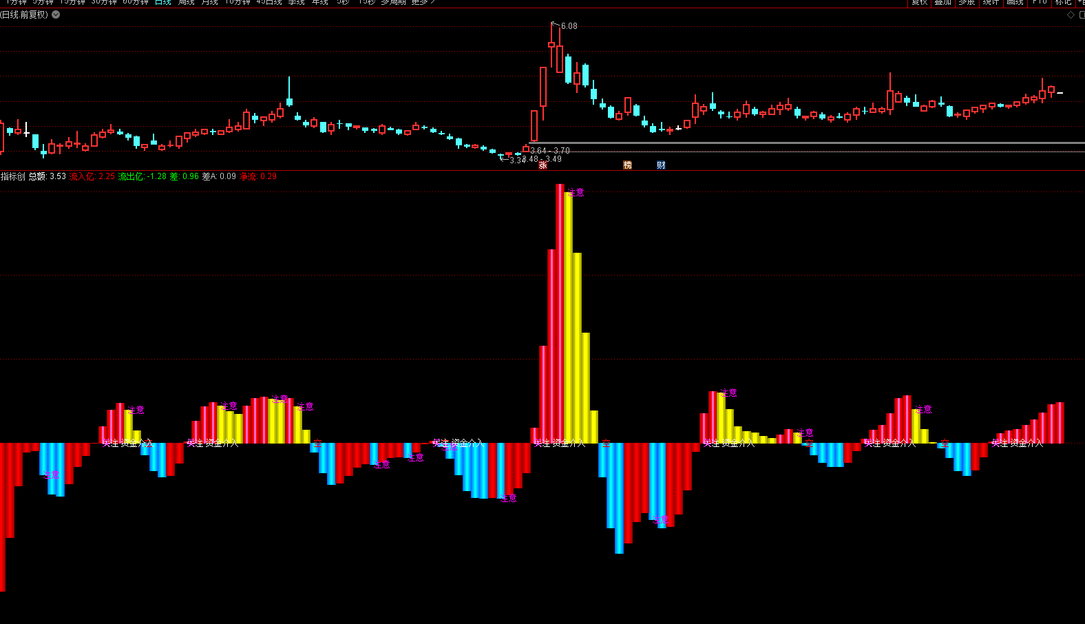 "注意":净流拐头(品红文字)