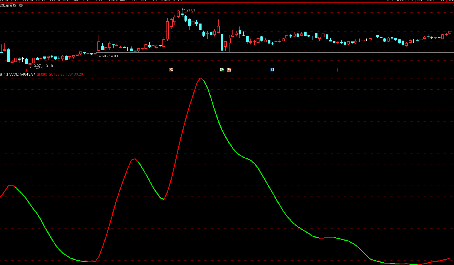IF(量趋势<REF(量趋势,1),量趋势,DRAWNULL),COLORGREEN,LINETHICK3;