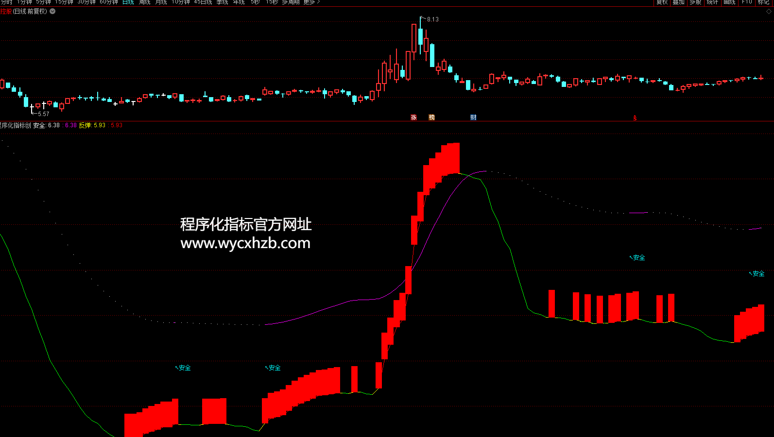 IF(安全>REF(安全,1) AND 安全>=0,安全,DRAWNULL),COLORFF00FF,LINETHICK1;