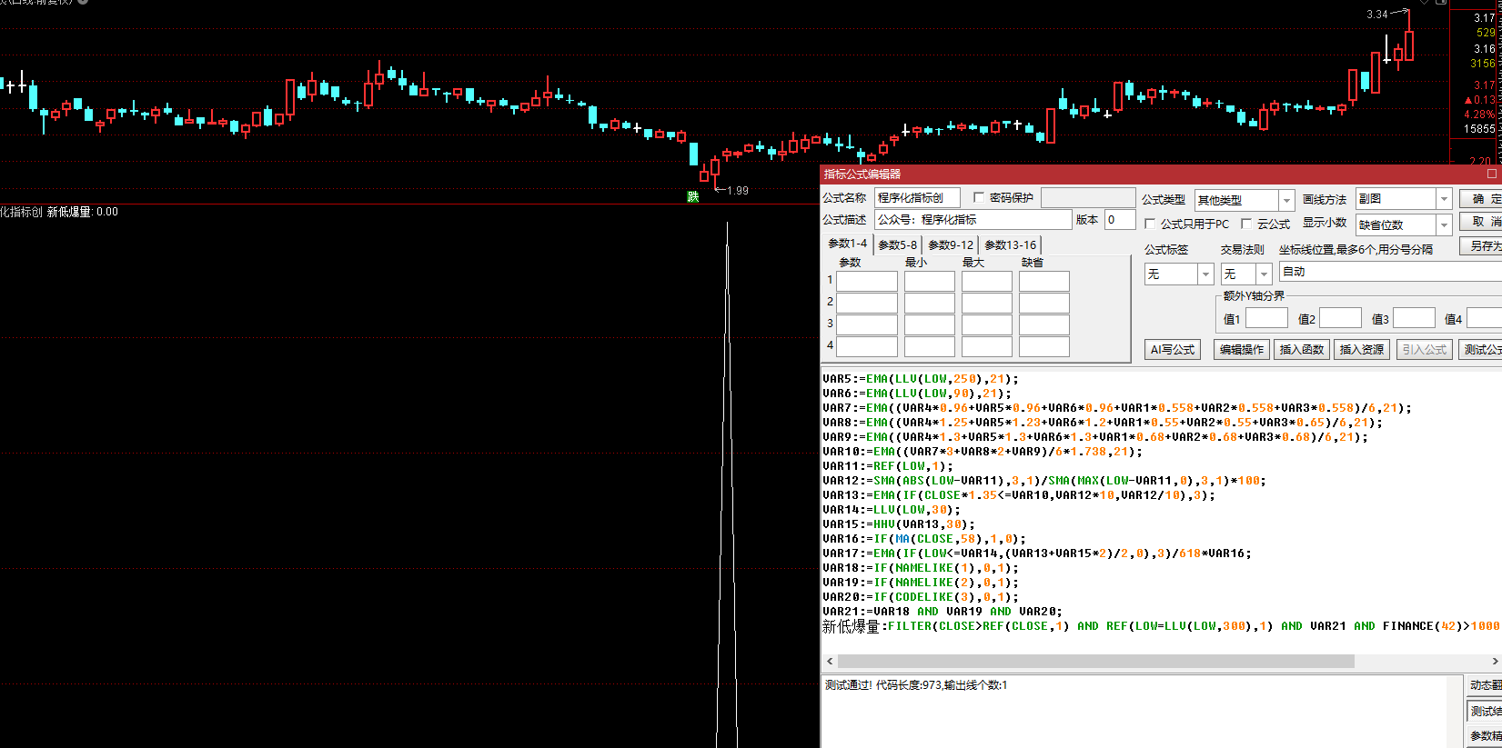 新低爆量:FILTER(CLOSE>REF(CLOSE,1) AND REF(LOW=LLV(LOW,300),1) AND VAR21 AND FINANCE(42)>1000,5) AND HHV(VAR17>50,3);