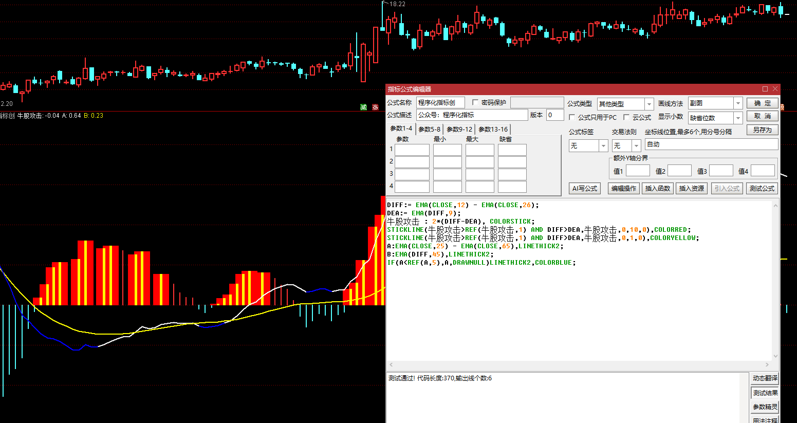 STICKLINE(牛股攻击>REF(牛股攻击,1) AND DIFF>DEA,牛股攻击,0,1,0),COLORYELLOW;