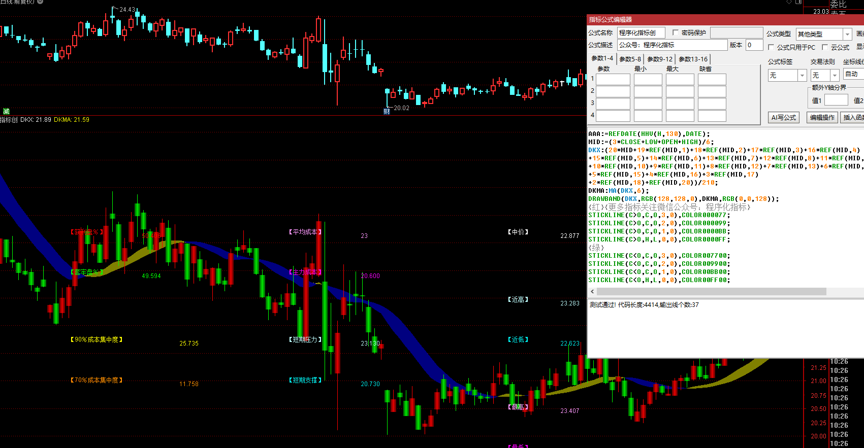 DRAWTEXT(T4=1 AND CURRBARSCOUNT=N1 AND PERIOD=5,AAA-(AAA*TS4),'【70%成本集中度】'),COLOR008FFF;