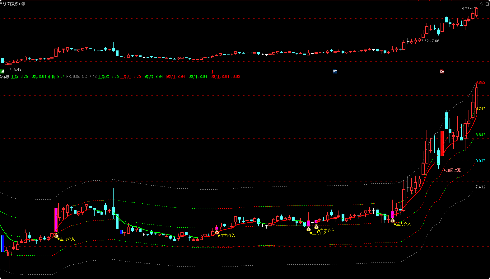 上轨绿:IF(上轨>=REF(上轨,1),上轨,DRAWNULL),DOTLINE,COLORGREEN,LINETHICK1;