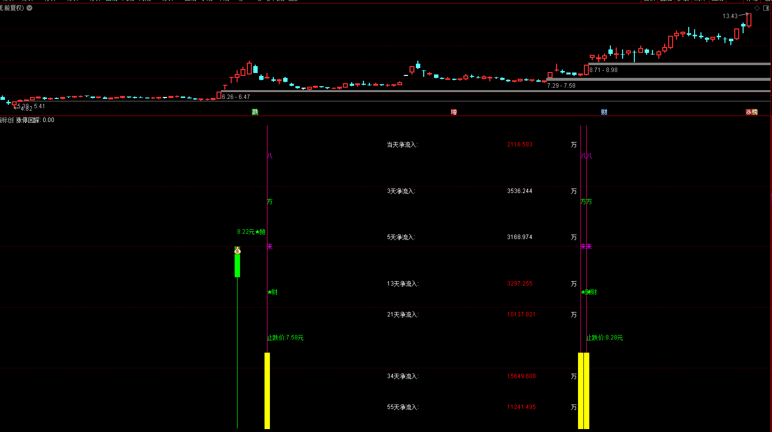 十三日净流入 := SUM(当日净流入, 13), COLORMAGENTA;