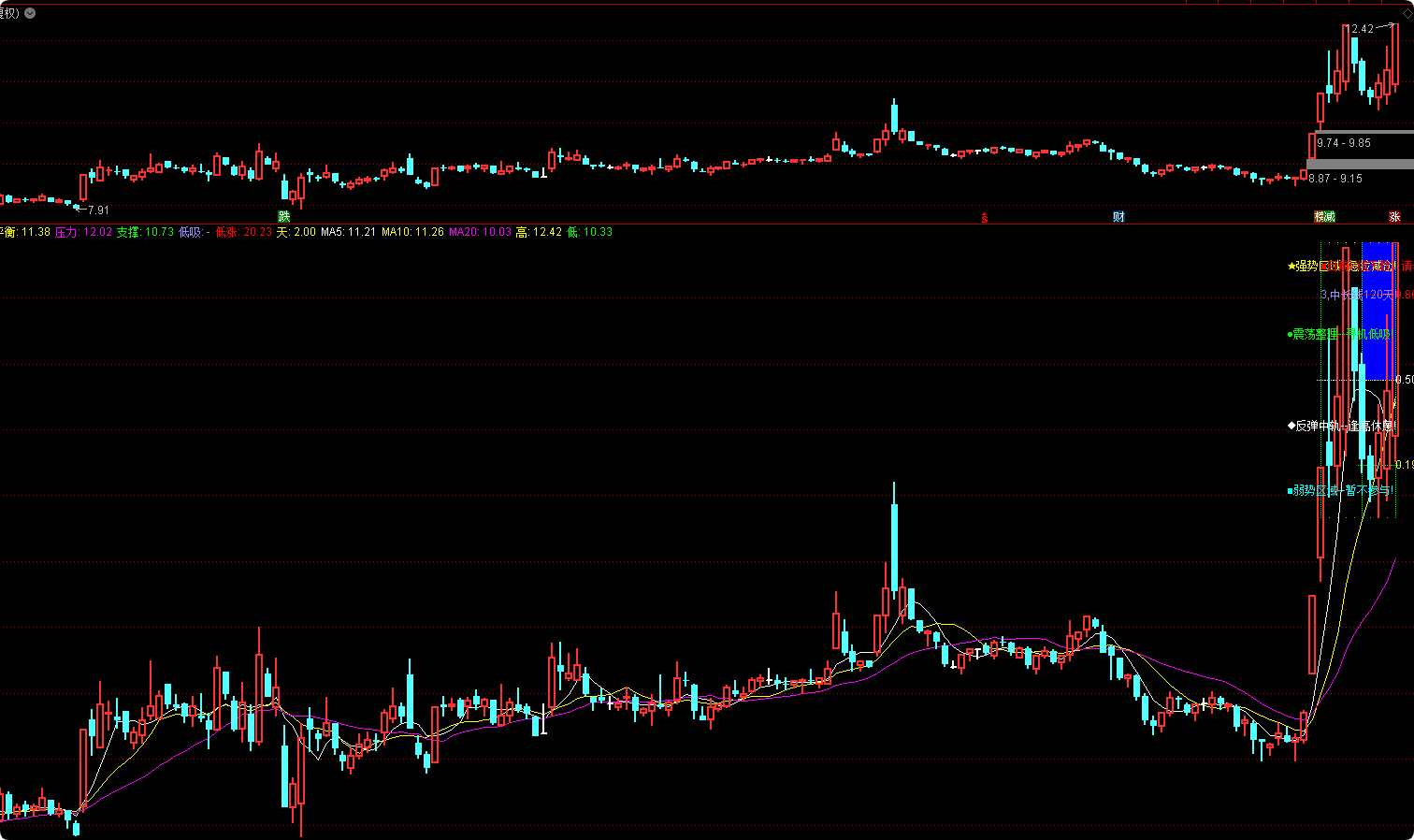 DRAWTEXT(CURRBARSCOUNT=N/2+9,GD-KJ/3,'●震荡整理--寻机低吸!'),COLOR00FF00;