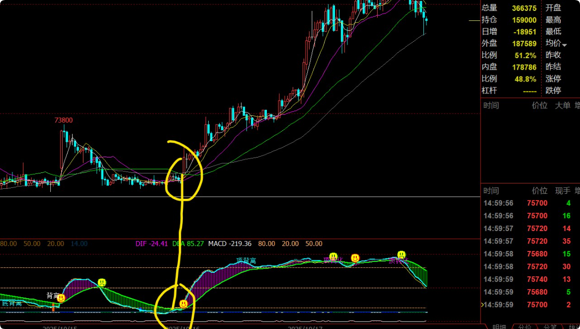 DRAWTEXT(REF(B,1)>80 AND CROSS(B1,B) AND REF(B,1)REF(C,K2+2),B+2,’顶背离’),COLOR00FFFF;