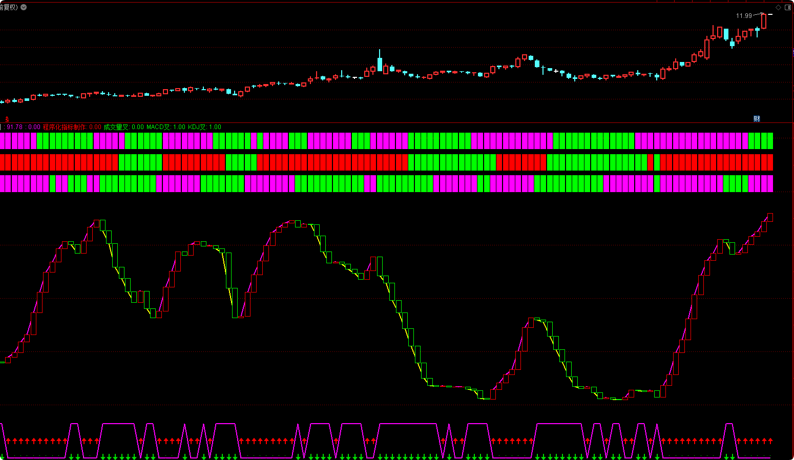 IF(趋势>=REF(趋势,1),0,13),COLORFF00FF,LINETHICK2;
