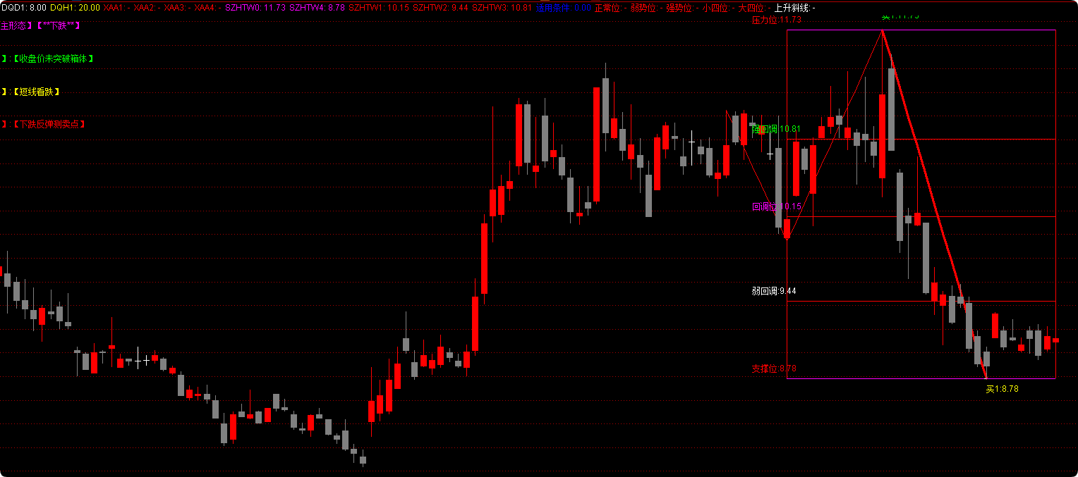 XHTCS1:=IF(DQD1>DQH1,CONST(GDH8/GH801),CONST(DDL8*GH801));{上升回调或下跌反弹计算反弹1号位置}