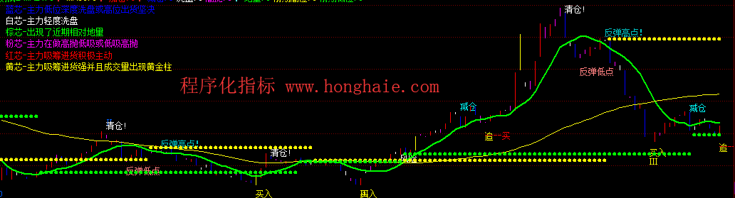 DRAWTEXT(EX2 AND PL20>REF(PL20,1) AND ZTJD10=2 OR (ZTJD10=0 OR ZTJD10=2) AND EX2,H*1.02,'清仓!'),LINETHICK3,colorwhite;