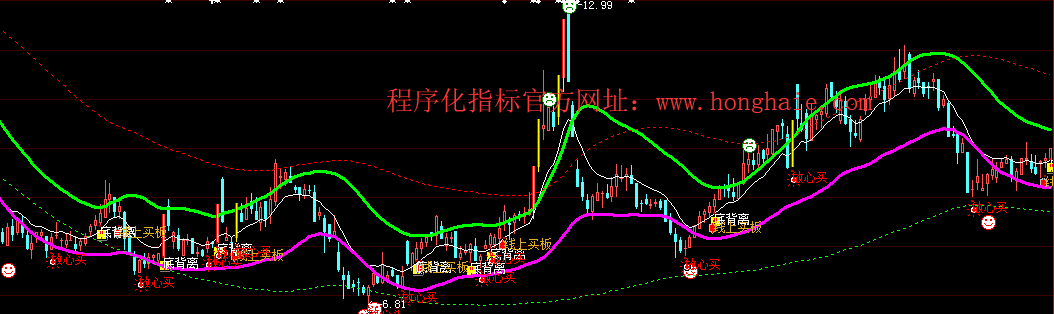 DRAWTEXT_FIX(C>O,0.01,0.9,0,' 微信公众号:程序化指标 网址:WWW.HONGHAIE.COM '),COLORRED;