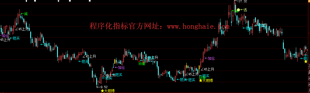 DRAWTEXT_FIX(C>O,0.01,0.9,0,' 微信公众号:程序化指标 网址:WWW.HONGHAIE.COM '),COLORRED;