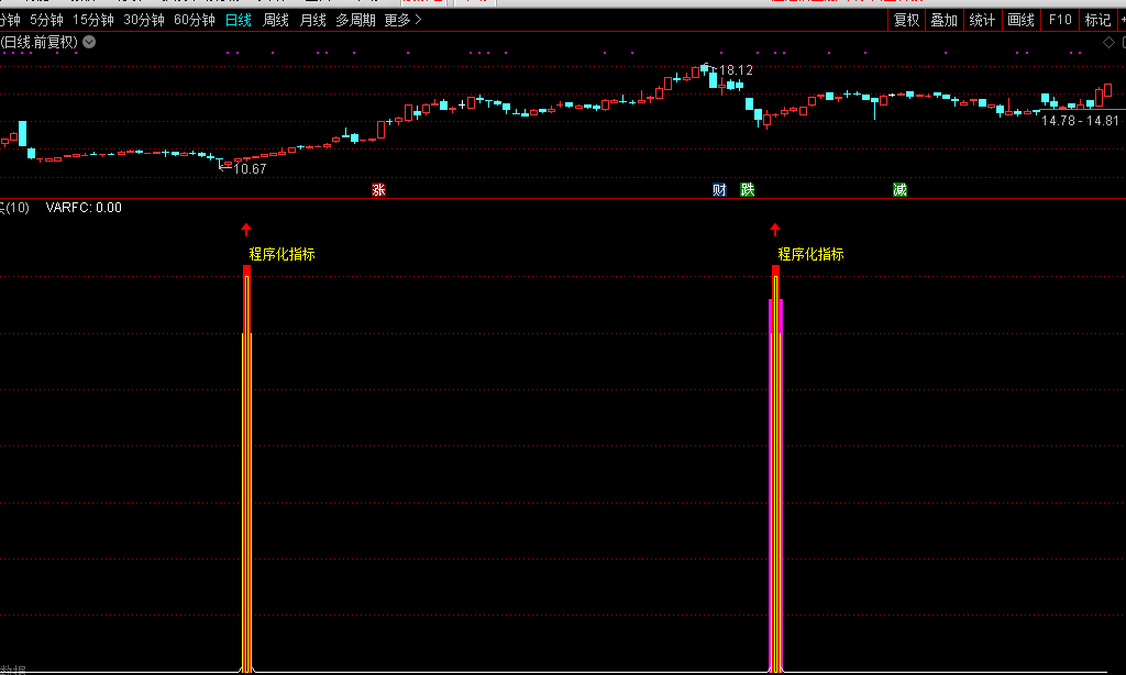 指标:DRAWTEXT(FILTER(VARFC=1,3),37,' 程序化指标'),COLORYELLOW;