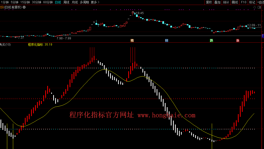 程序化指标:EMA(0.382*REF(FB,2)+0.618*FB,12),COLORYELLOW;
