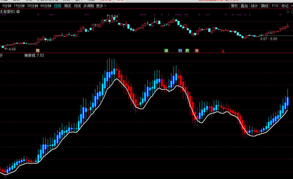 转折线:IF(B=-1,MA(HIGH,6),MA(LOW,6)),LINETHICK2,COLORFFFFFF;