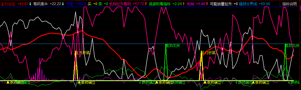 买:IF( 底部>REF(底部,1),40,0),coloryellow,LINETHICK3; DRAWTEXT(买,40,'主力抄底 '),coloryellow;