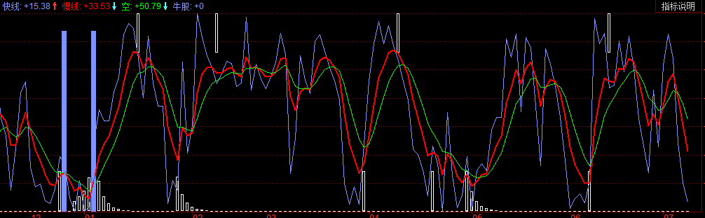 牛股:IF(BARSLAST(CROSS(慢线,空))<P AND BARSLAST(CROSS(空,慢线))<P AND CROSS(慢线,空) AND 慢线<20,90,0),STICK,COLORFF937F;