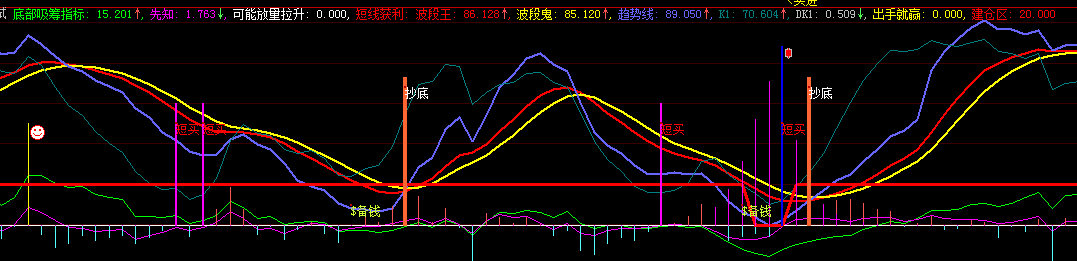 VAR2:=REF(LOW,1); VAR3:=SMA(ABS(LOW-VAR2),3,1)/SMA(MAX(LOW-VAR2,0),3,1)*100; VAR4:=EMA(IF(CLOSE*1.3,VAR3*10,VAR3/10),3); VAR5:=LLV(LOW,30); VAR6:=HHV(VAR4,30); VAR7:=IF(MA(CLOSE,58),1,0); VAR8:=EMA(IF(LOW<=VAR5,(VAR4+VAR6*2)/2,0),3)/618*VAR7; VAR9:=IF(VAR8>100,100,VAR8); STICKLINE(VAR9>-150,0,VAR9,0.3,0), COLORFF00FF; 底部吸筹指标:(CLOSE-MA(CLOSE,40))/MA(CLOSE,40)*100,COLOR00FF00; STICKLINE(CROSS(底部吸筹指标,-24),100,0,1,0), COLORFFFFFF; 先知: (CLOSE-MA(CLOSE,5))/MA(CLOSE,5)*100, COLORFF00FF; 可能放量拉升:IF(CROSS(底部吸筹指标,-24),1,0), COLORFFFFFF; 短线获利:STICKLINE(REF("KDJ.J",1)<0 AND "KDJ.J">0,60,0,2,0),COLOR0000FF; VARK1:=(CLOSE-LLV(LOW,27))/(HHV(HIGH,27)-LLV(LOW,27))*100; VARK2:=REVERSE(VARK1); VARK3:=SMA(VARK1,3,1); 波段王:SMA(VARK3,3,1), COLORRED,LINETHICK2; 波段鬼:SMA(波段王,2.5,1),COLORYELLOW,LINETHICK2; 趋势线: 3*SMA((CLOSE-LLV(LOW,27))/(HHV(HIGH,27)-LLV(LOW,27))*100,5,1)-2*SMA(SMA((CLOSE-LLV(LOW,27))/(HHV(HIGH,27)-LLV(LOW,27))*100,5,1),3,1),COLORFF6666,LINETHICK2; RSV9:=(CLOSE-LLV(LOW,9))/(HHV(HIGH,9)-LLV(LOW,9))*100; K1:SMA(RSV9,3,1); DK1:K1-REF(K1,1),COLORSTICK; 出手就赢:IF(DK1>7 AND REF(DK1,1)<0 AND (DK1-REF(DK1,1))>9,50,0), STICK,COLORYELLOW;DRAWICON(出手就赢>0,50 ,1); STICKLINE( CROSS(趋势线,10),0,73,3,0), COLOR3366FF; DRAWTEXT(IF(CROSS(趋势线,10),100,0),68,'抄底'),COLORWHITE ; DRAWTEXT(IF(CROSS(10,趋势线),1,0), 10,'$备钱'),COLOR33FFCC; DRAWTEXT(REF("KDJ.J",1)<0 AND "KDJ.J">0,50,'短买'),COLORRED ; DRAWTEXT(CROSS(底部吸筹指标,-24),80,'抄底'),COLORWHITE ; RSV:=(((CLOSE - LLV(LOW,9)) / (HHV(HIGH,9) - LLV(LOW,9))) * 100); 短期底部:=LLV(OPEN,30); K:=SMA(RSV,3,1); D:=SMA(K,3,1); J:=((3 * K) - (2 * D)); AA10:=MA(CLOSE,10); AA12:=MA(CLOSE,12); BB10:=((ATAN((AA10 - REF(AA10,1))) * 3.1416) * 10); BB12:=((ATAN((AA12 - REF(AA12,1))) * 3.1416) * 10); MA13:=MA(CLOSE,13); VARB:=(((CLOSE - MA(CLOSE,6)) / MA(CLOSE,6)) * 100); VARC:=(((CLOSE - MA(CLOSE,12)) / MA(CLOSE,12)) * 100); VARD:=(((CLOSE - MA(CLOSE,24)) / MA(CLOSE,24)) * 100); VARE:=(((VARB + (2 * VARC)) + (3 * VARD)) / 6); VARF:=MA(VARE,3); STICKLINE((CROSS(J,0) AND (VARF <= (0 - 7))),0,88,2,0),COLORBLUE; DRAWICON((CROSS(J,0) AND (VARF <= (0 - 7))),88,9); VARO2:=(CLOSE-LLV(LOW,26))/(HHV(HIGH,26)-LLV(LOW,26))*100; VARO3:=SMA(SMA(VARO2,3,1),3,1); VARO4:=EMA(VARO3,5); VARO5:=LLV(LOW,26); VARO6:=HHV(HIGH,34); VARO7:=EMA((CLOSE-VARO5)/(VARO6-VARO5)*4,4)*25; STICKLINE(CROSS(VARO4,10) AND VARO4>10,25,0,1,0),COLORYELLOW; 建仓区: IF((VARO7<10),0,20),LINETHICK3 ,COLORred;