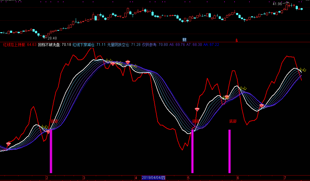 DRAWTEXT(CROSS(红线下穿减仓,红线在上持股),红线下穿减仓,'小心'),COLORYELLOW;