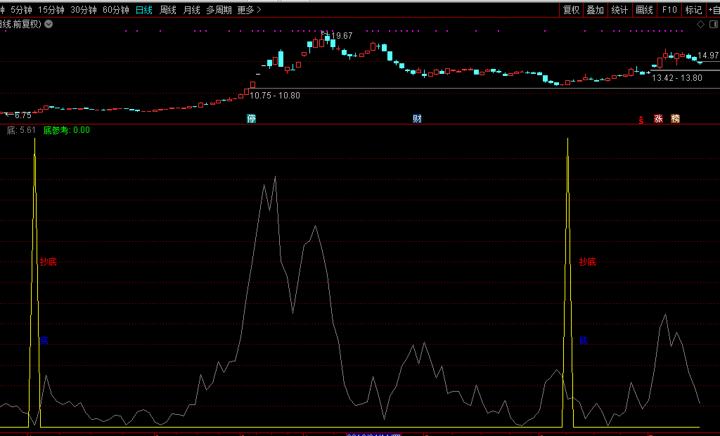 出击:=IF(CROSS(趋势,人气) AND (趋势<30),20,0);