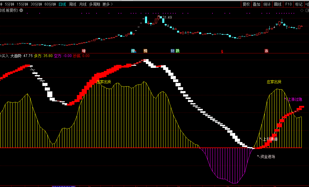 程序化指标:= (IF((V7>=200 AND V6>=150) OR CROSS(65,多方),15,IF(V7<=-200