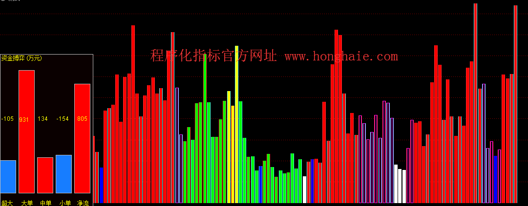 DRAWRECTREL(0,CONST(830-(ABS(超大单)*500/DAZHI)),30,935,IF(CONST(超大单)>0,RGB(255,0,0),RGB(23,125,255)));