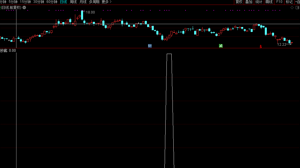 抄底:IF(V8>=1 AND V9>=1 AND CLOSE>OPEN AND REF(CLOSE,1)>REF(OPEN,1) AND VOL>REF(VOL,1),1,0);