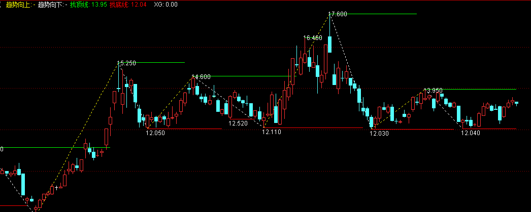 趋势向下:DRAWLINE(NN,H,UU,L,0),COLORWHITE,DOTLINE;