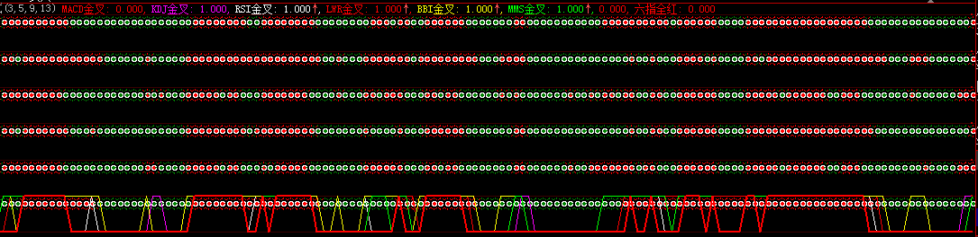 六指全红:LAST(MACD金叉 AND KDJ金叉 AND RSI金叉 AND LWR金叉 AND BBI金叉 AND MMS金叉),COLORRED,LINETHICK0;
