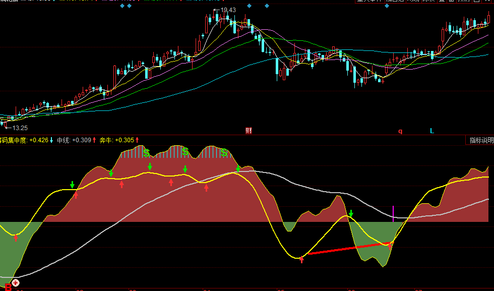 底背离:=REF(CLOSE,A1+1)>CLOSE AND 奔牛>REF(奔牛,A1+1) AND CROSS(奔牛,AAA);