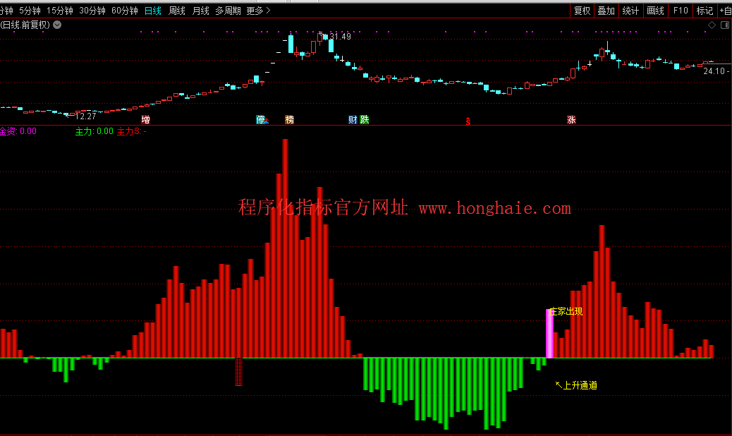 主力S:IF(主力>REF(主力,1),主力,DRAWNULL)*HAN,COLORRED,LINETHICK2;