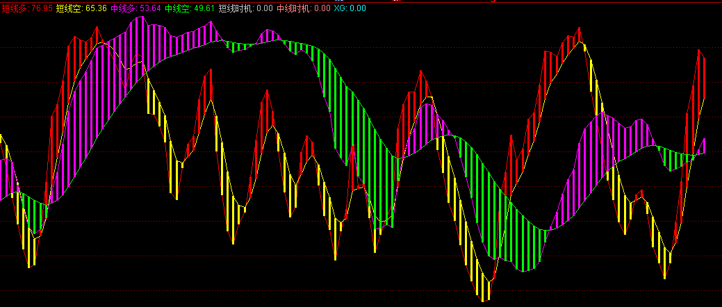 XG:短线时机 AND 中线时机 AND 短线多>中线多 AND DYNAINFO(4)>0,COLORCYAN,NODRAW;