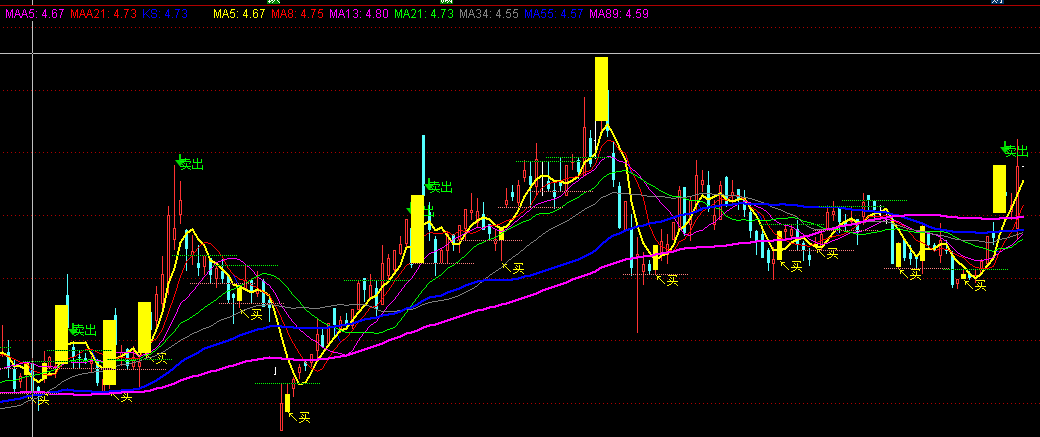 DRAWTEXT(FILTER(买=1,5),LOW-0.05,'↖买'),COLORYELLOW;