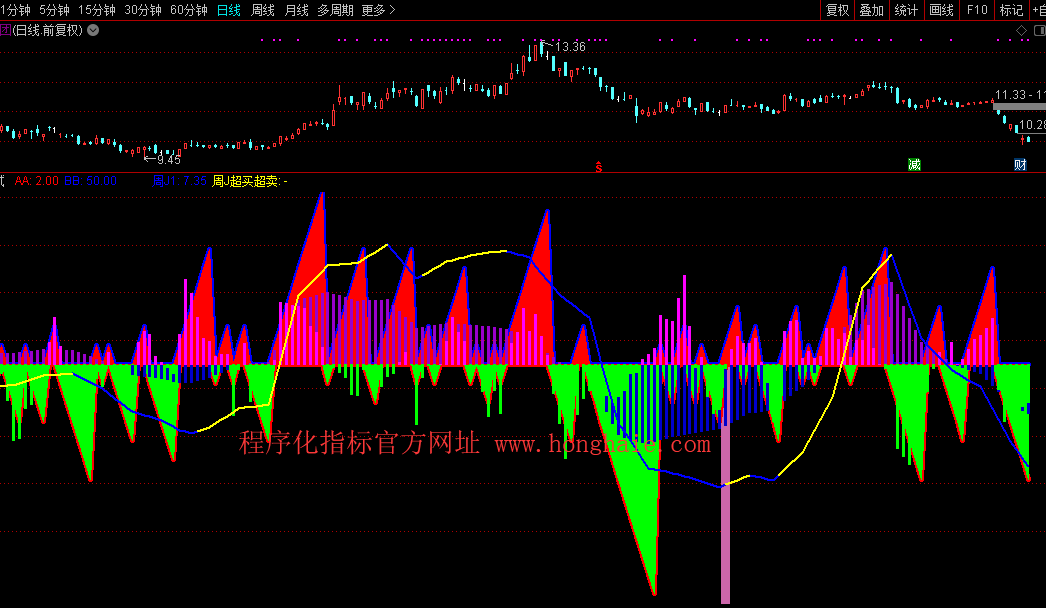 关注区:STICKLINE(周J>=REF(周J,1) AND 周J<0,-50,50,5,0),COLORAA66CC;
