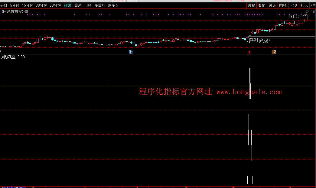 跳空:=L>REF(H,1);{程序化指标官方网址 WWW.HONGHAIE.COM}