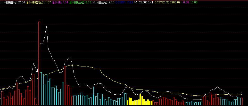 STICKLINE(CCDS3>ML AND CCDS7<0 AND CCDS3>REF(CCDS3,3) AND CCDS7>REF(CCDS7,3),VOL,0,3,0) COLORYELLOW;