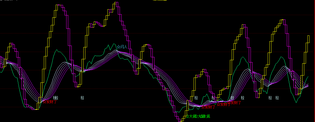 DRAWTEXT(CROSS(AA, A5) AND REF(AA,1)<34,REF(AA,1),'☆发财了'), COLORRED;