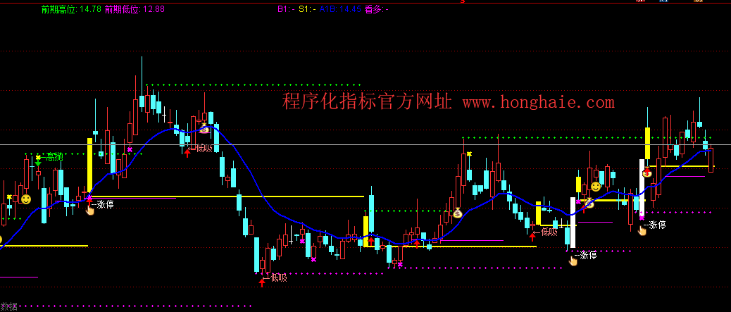 STICKLINE(跌停,OPEN,CLOSE,-1,0),COLORBLUE;