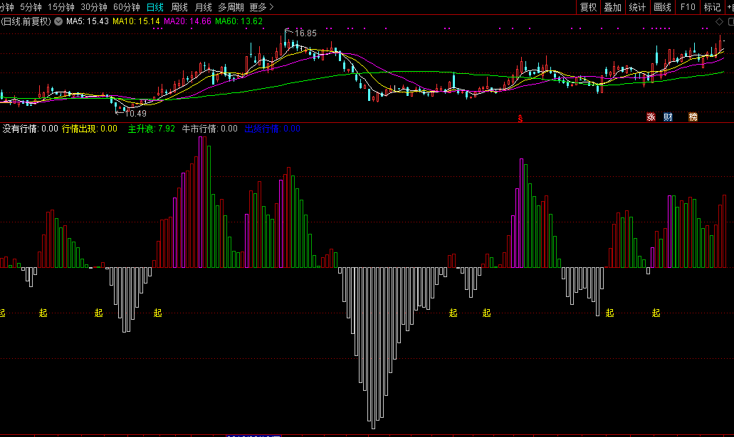 行情出现:IF(A10,5,0),LINETHICK0,COLOR00AAAA;