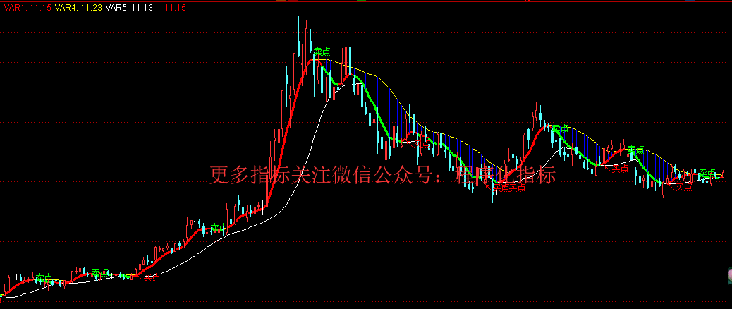DRAWTEXT(REF(VAR4,1)=REF(VAR1,1) AND VAR4>VAR1,H,'卖点'),COLORGREEN;